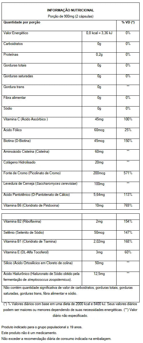 INGREDIENTES: Vitamina C (Ácido Ascórbico), Ácido Fólico, Biotina (D-Biotina), Aminoácido Cisteína (Cisteína), Colágeno Hidrolisado, Fonte de Cromo (Picolinato de Cromo), Levedura de Cerveja (Saccharomyces cerevisiae), Ácido Pantotênico (D-Pantotenato de Cálcio), Vitamina B6 (Cloridrato de Piridoxina), Vitamina B2 (Riboflavina), Selênio (Selenito de Sódio), Vitamina B1 (Cloridrato de Tiamina), Vitamina E (DL-Alfa Tocoferol), Silício (Ácido Ortosilícico em Cloreto de colina), Ácido Hialurônico (Hialuronato de Sódio obtido pela fermentação de streptococcus zoopidemicus).