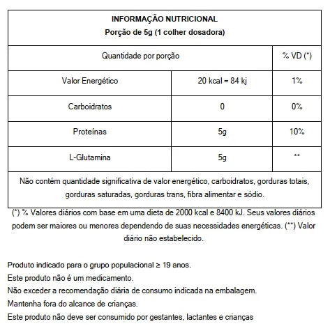 Contraindicação: - Indivíduos com hipersensibilidade a L-Glutamina. - Indivíduos com problemas hepáticos e renais devem passar por supervisão médica.