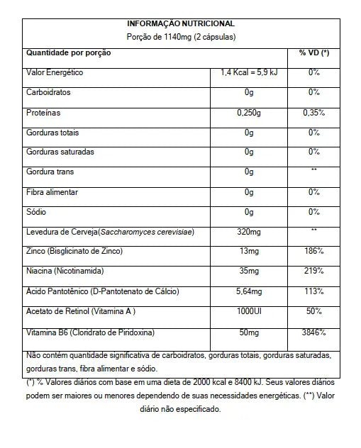 INGREDIENTES: Levedura de Cerveja (Saccharomyces cerevisiae), Zinco (Bisglicinato de Zinco), Niacina (Nicotinamida), Ácido Pantotênico (D-Pantotenato de Cálcio), Vitamina A (Acetato de Retinol), Vitamina B6 (Cloridrato de Piridoxina).